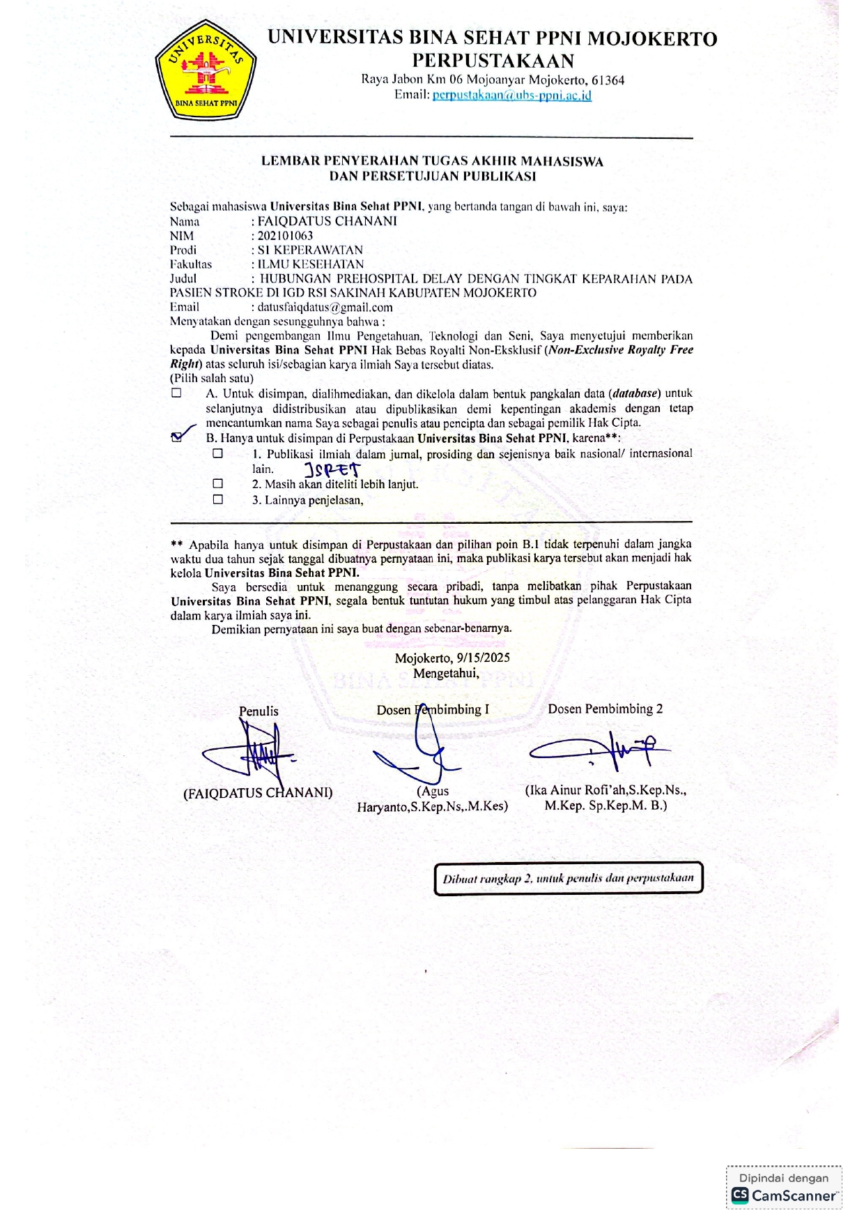 HUBUNGAN PRE HOSPITAL DELAY DENGAN TINGKAT KEPARAHAN PADA PASIEN STROKE DI IGD RSI SAKINAH KABUPATEN MOJOKERTO
